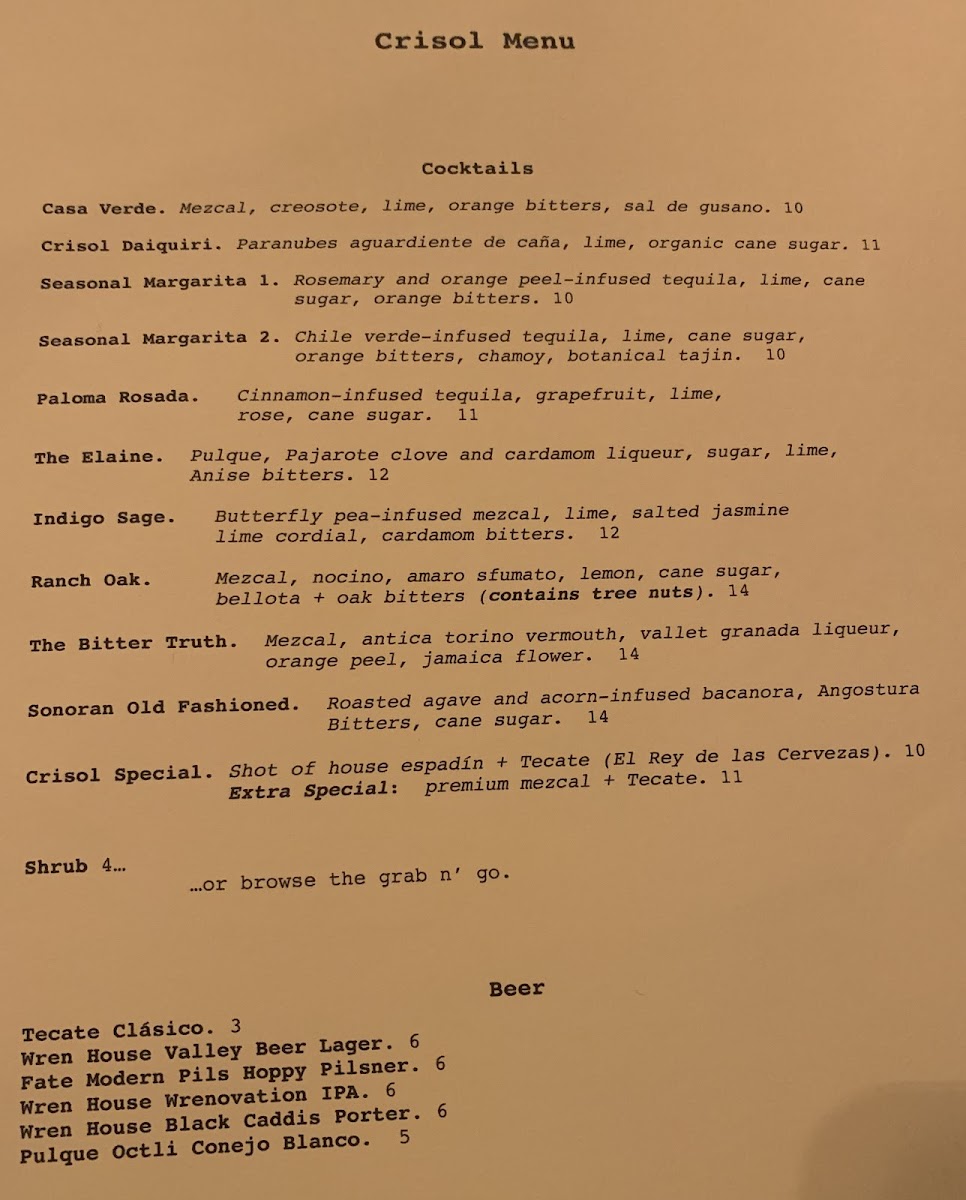 Bar Crisol/Exo offers a menu that blends simple café fare with thoughtful casual bites, creating a setting ideal for both quiet mornings and relaxed evenings. You’ll find comforting drinks like cortados, matcha lattes, and their distinctive chiltepin cold brew alongside approachable snacks and small dishes.